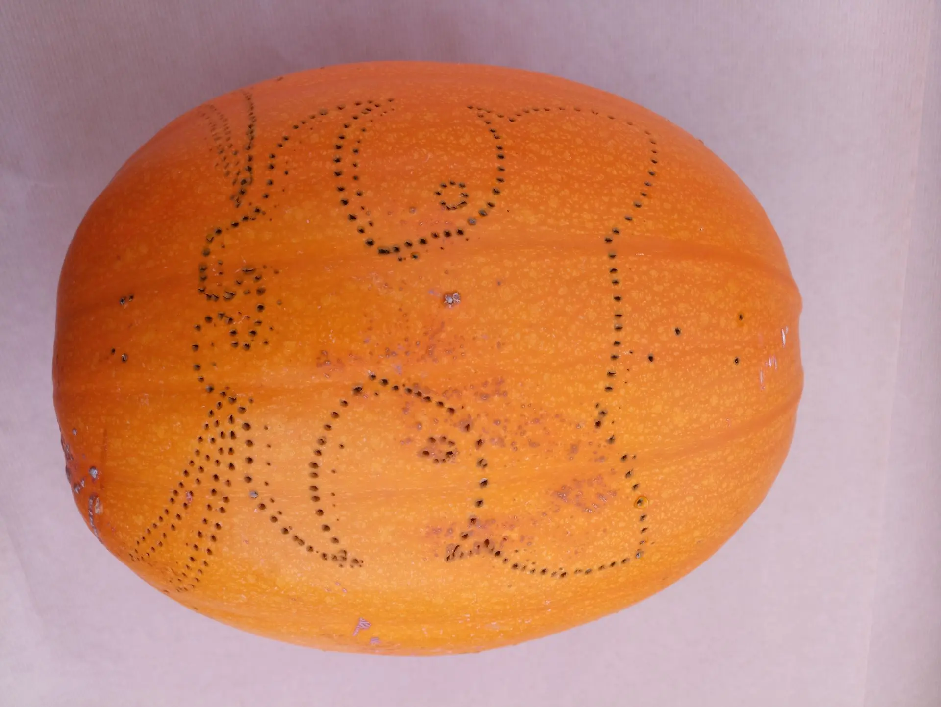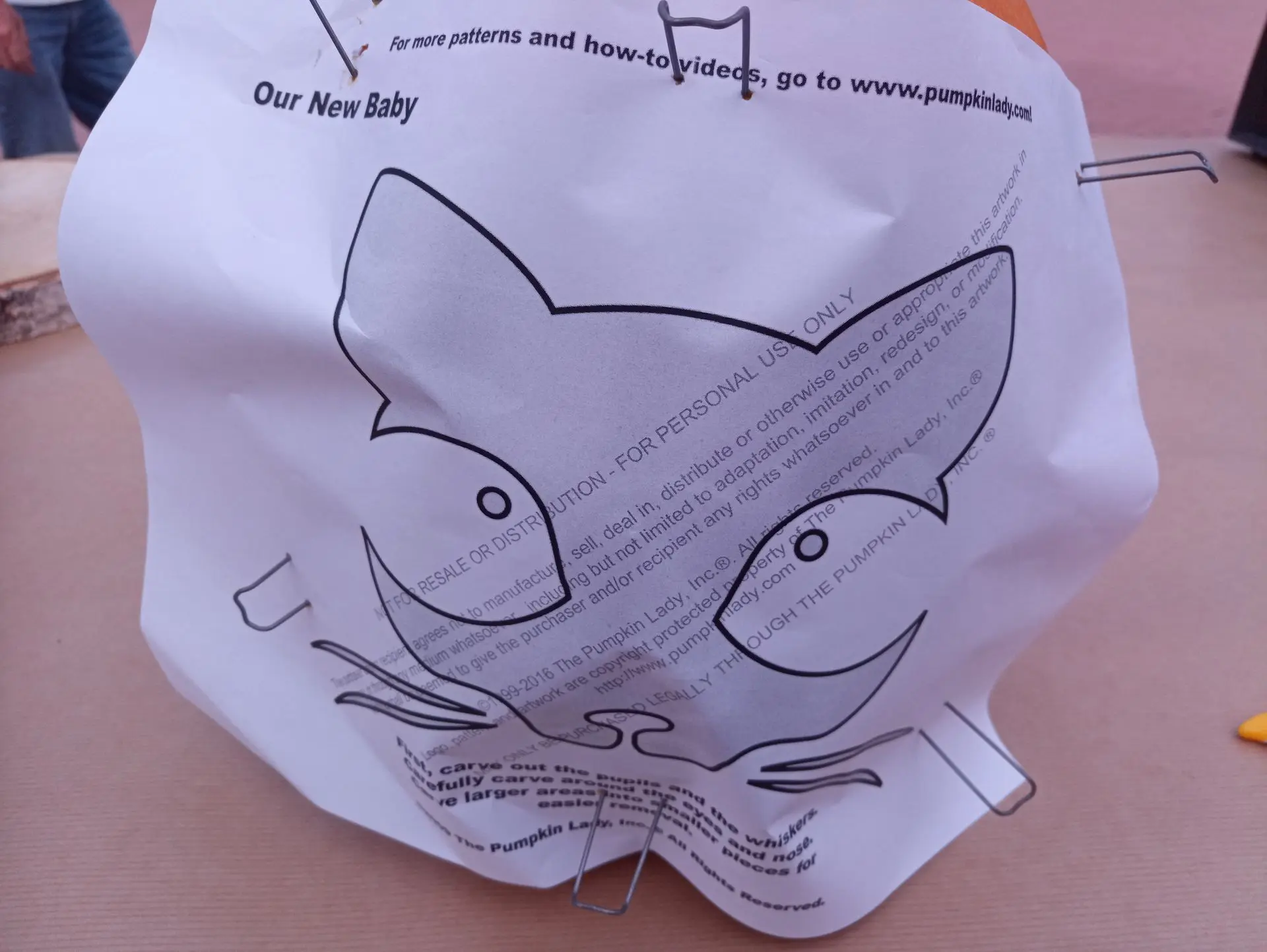 - Bevestig het sjabloon met krammen of tape op de pompoen.