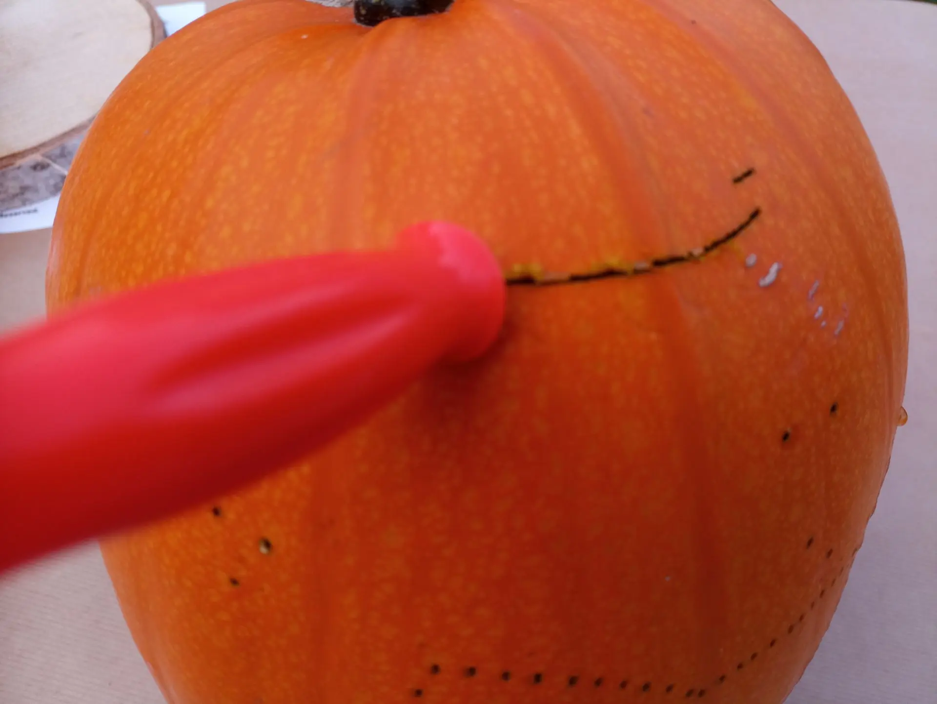 Gebruik een pompoenzaagje en snijd eerst het deksel van de pompoen. Maak de opening niet te groot, anders blijft er te weinig oppervlak over om uit te snijden.