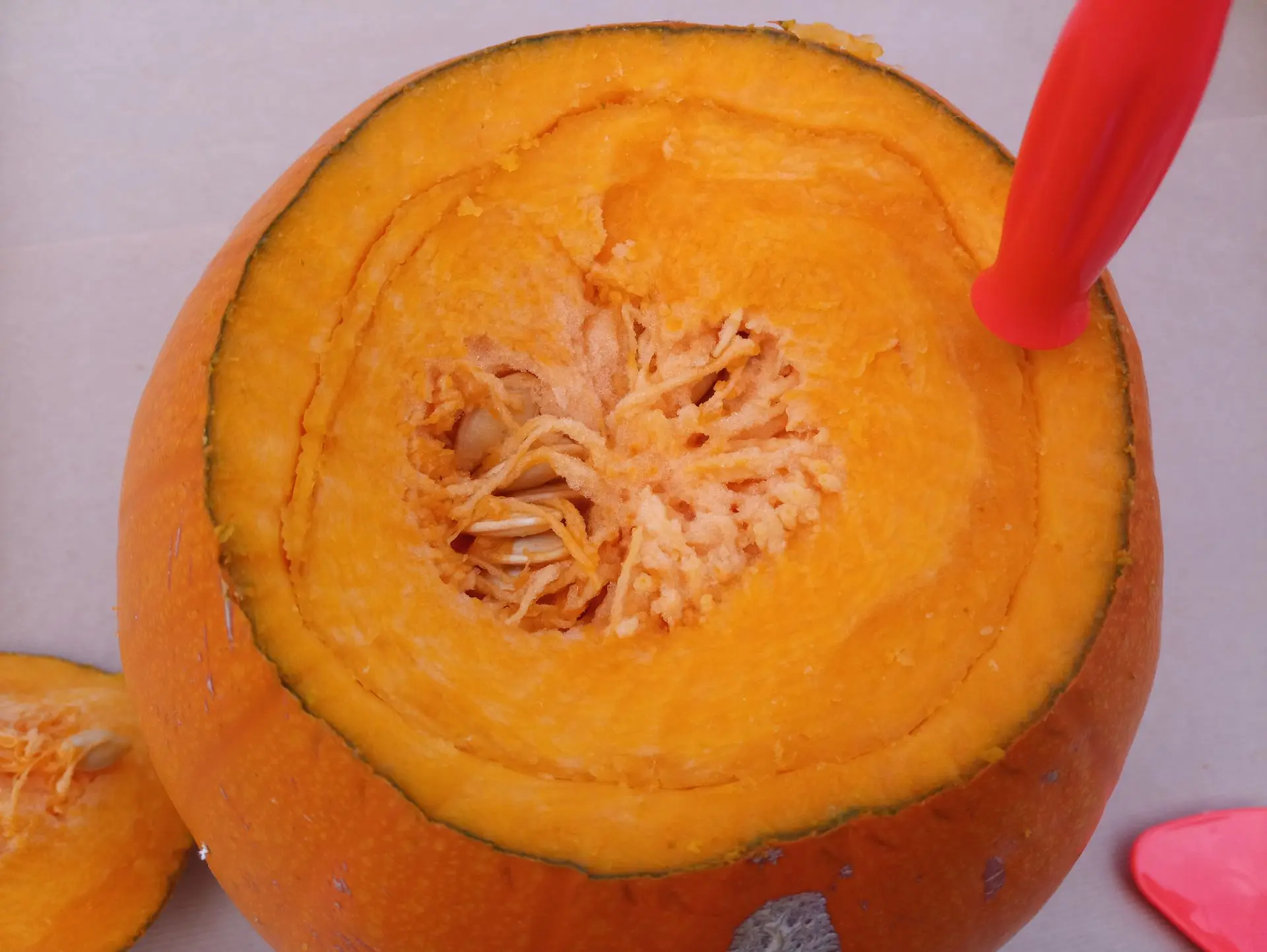 Haal zoveel mogelijk vruchtvlees weg. Hoe schoner de pompoen, hoe makkelijker het uitsnijden gaat én hoe langer hij mooi blijft.